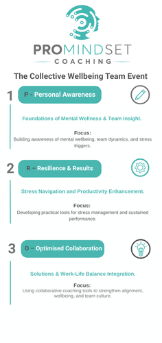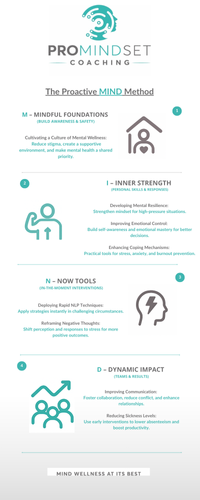 The Proactive MIND Method is an evidence-based, in-house workshop programme designed to strengthen organisational wellbeing, resilience, and productivity. Delivered as a full-day, interactive experience, it combines coaching and NLP techniques with a structured, preventative framework that empowers teams to perform at their best.(CPD Accredited).