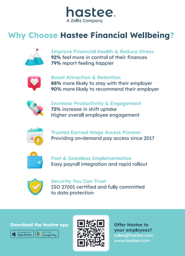 Part of the Zellis Group, Hastee provides payroll integrated financial wellbeing, earned wage access, AI coaching, state benefits eligibility, financial education, retail discounts, payroll savings and credit building tools through the lens of 'earn, learn, grow'. We help your workforce on their personal financial journeys, reducing stress, improving productivity, employee engagement, and loyalty to reduce hiring costs whilst enabling you to position yourself as an employer of choice.