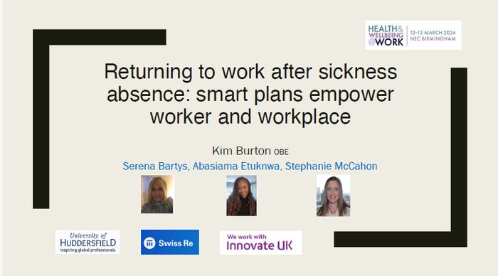 Maintaining work ability for people with health problems is an unsolved, and a current policy focus. We know from the available scientific evidence much of what works, yet transferring that knowledge has been inconsistent and implementation at scale remains a challenge. The use of ‘smart’ RTW Plans is one potential way to bring all the key players onside and coordinate their actions. A recent Knowledge Transfer Partnership between University of Huddersfield and Swiss Re explored this topic from an innovative angle – that of engaging and empowering the worker to develop their own RTW Plan, along with exploration of alternative implementation routes. This has resulted in a wayfinding approach that is health condition agnostic, can deliver the knowledge, and contains the tools to smooth the journey from sickness absence to work – the ‘smart’ RTW Plan.