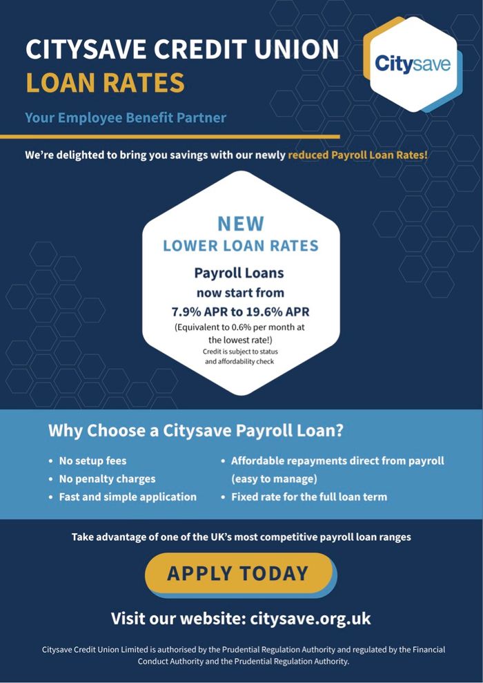 Citysave Credit Union is delighted to introduce newly reduced Payroll Loan rates, now starting from 7.9% APR (up to 19.6% APR)