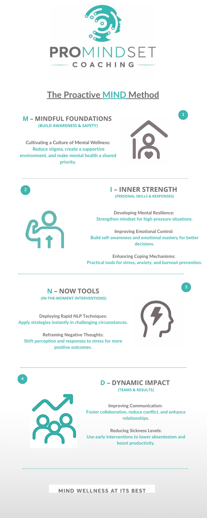 The Solution: The M-I-N-D Framework Our workshop is built on the Proactive MIND Method, a four-stage journey that bridges the gap between intention and high-performance results.